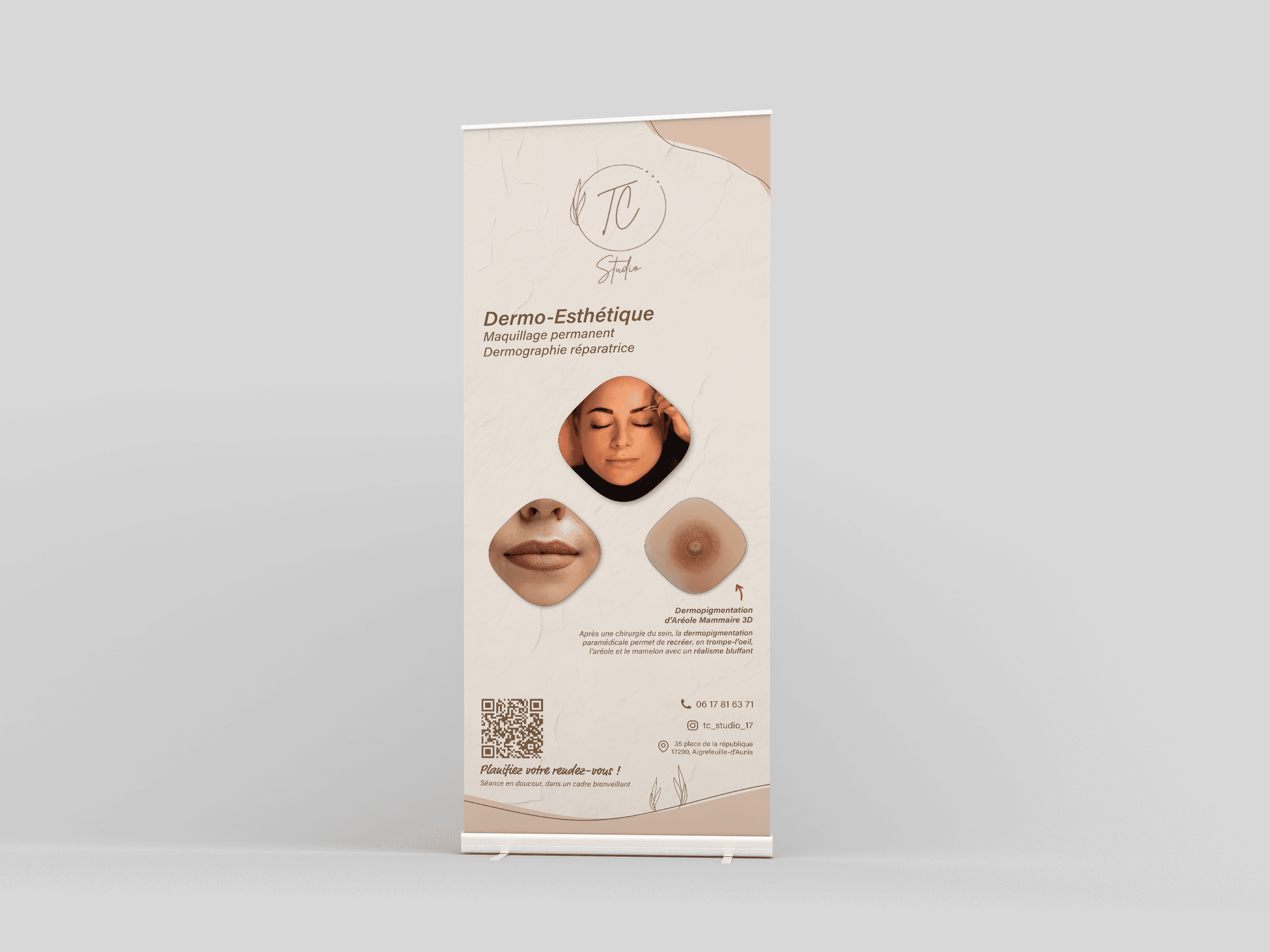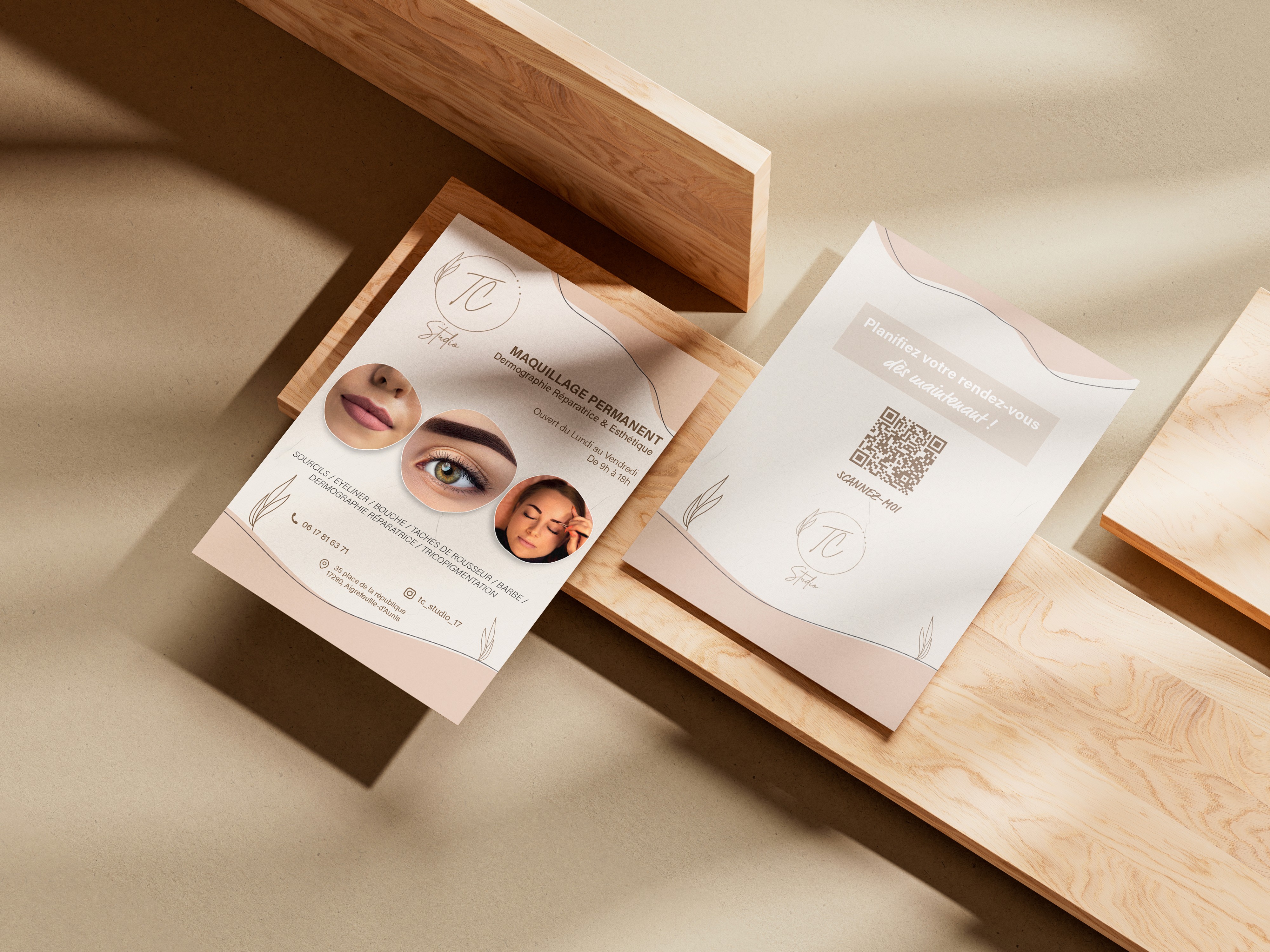 Dans le cadre de l’ouverture de TC Studio, institut de beauté spécialisé dans le maquillage permanent, j’ai réalisé l’ensemble des supports de communication imprimés : flyer, carte de visite et roll-up.